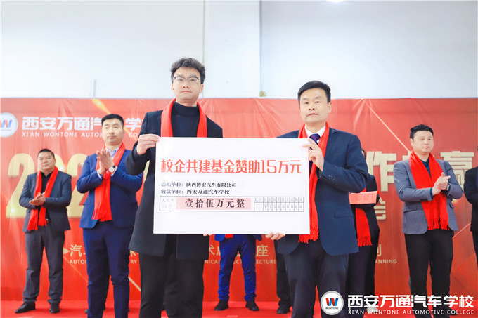為助力學生的汽車夢想,讓更多人的學生可以安心學技術,陜西博宏汽車服務有限公司李總與德邦汽車集團張經理分別代表企業向我校贊助了共計二十五萬元助學金,切實減輕萬通學生們學習時的經濟壓力!