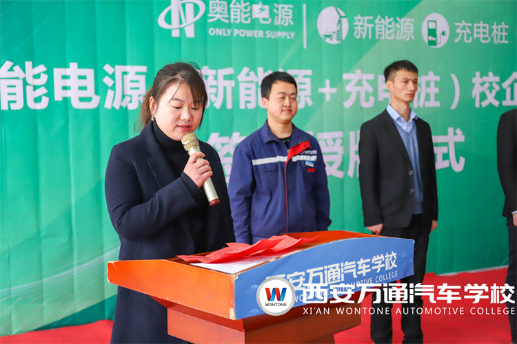 隨后,杭州奧能電源人事經理發表講話。她表示,人才匱乏一直是制約企業大力發展的關鍵因素,尤其是在新能源行業發展勁頭強勢的時代背景下,人才儲備顯得尤為重要。此次與萬通達成合作,舉行簽約儀式,為奧能電源的人才儲備奠定了堅實基礎。我們和西安萬通有著良好的合作基礎,在以往的接觸中,萬通學子的專業水平,綜合素養,精神面貌都給她留下了深刻印象,奧能電源永遠歡迎萬通學子選擇奧能電源作為他們的就業平臺。