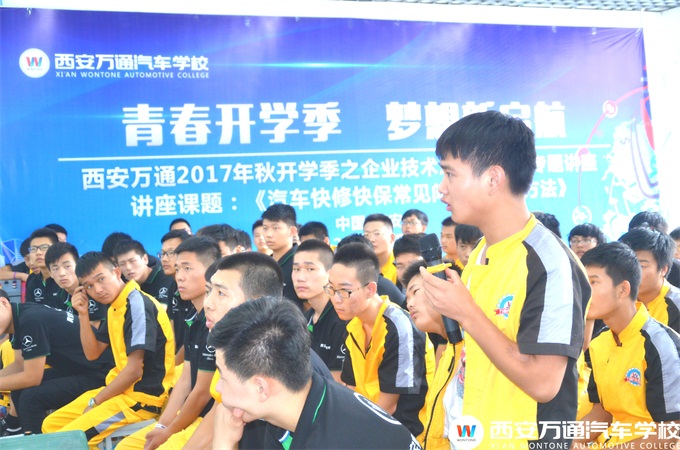 針對此次的講座,馬總監做了充足的準備。在演示環節上,馬總監按照項目工單上羅列的各項快修快保項目,在他的指導下,由一名企業技術員工以及西安萬通的在校生進行實時操作,汽車快修快保常見問題及解決方法就在這一講一做中進行著。而且,在關鍵之處,或是需要注意的步驟,馬總監會詳細清晰的為學子們講解,全場的學子們也一邊聽一邊觀摩,很是專注與投入,最后學生對此次企業總監的講座也有著很好反響。