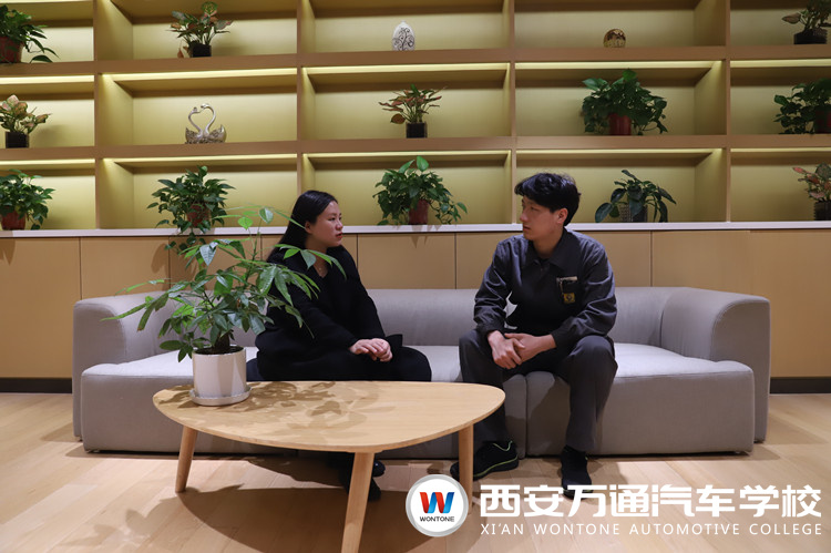 學子劉鵬,今年21歲,2020年從萬通畢業后就職于陜西龍泰廣興領克中心,目前月薪7000+,擔任售后服務顧問一職。在訪談中他講到,見到母校老師他十分激動,沒想畢業后學校老師還會來到他的就業企業一對一回訪指導。工作以后他有了新的感悟和思考,趁此機會和彭主管進行了深入的交流。彭主管也在訪談中勉勵他們要勤奮工作、拼搏進取,為企業做貢獻,為西安萬通爭光,多回母校看看。