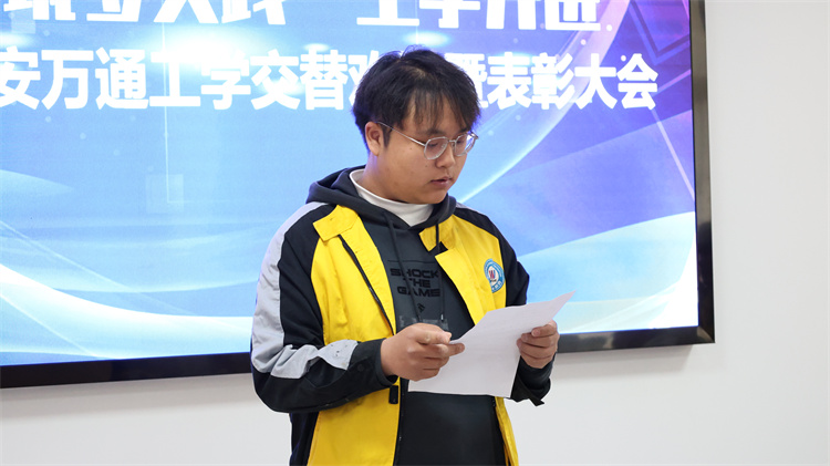 經(jīng)驗傳遞,共筑成長橋梁 駐場帶隊教師張毅從實習管理、學生表現(xiàn)等角度總結(jié)工作,高度贊揚學生吃苦耐勞的品格,并寄語新一批實習生“腳踏實地、精益求精”。即將踏上實習崗位的新生代表則鄭重承諾:“以學長學姐為榜樣,嚴守紀律、勤學善問,展現(xiàn)西安萬通學子的風采。”