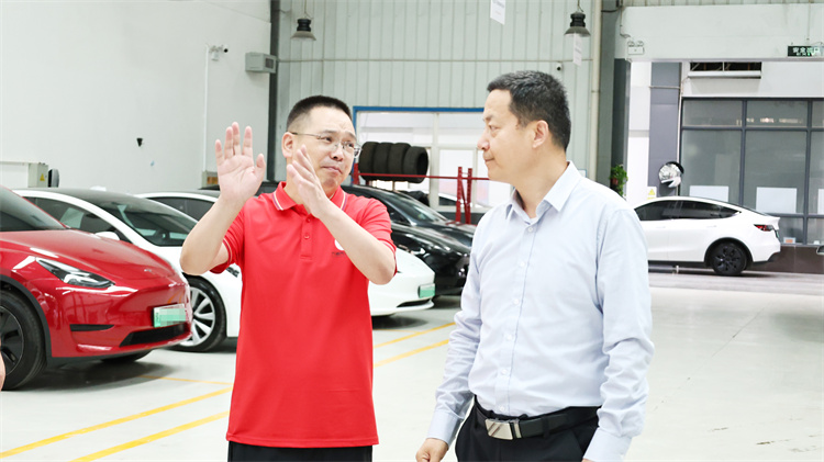 在恒泰集團劉團東總經理的全程引領下,李校長一行實地考察了集團旗下特斯拉、小米等一線新能源汽車品牌的現代化售后維保中心,并就提升校企合作質量、共育高素質技術技能人才進行了深入交流。 李登寶校長一行首先走進恒泰新能源特斯拉授權鈑噴服務中心。車間內整潔明亮,設備精良,隨后,考察團移步至小米新能源汽車服務專區。這里展現的智能化服務流程、用戶數據深度交互管理平臺以及針對新銳品牌特點定制的維保方案,生動呈現了新能源汽車售后領域“軟硬件融合”的新趨勢。
