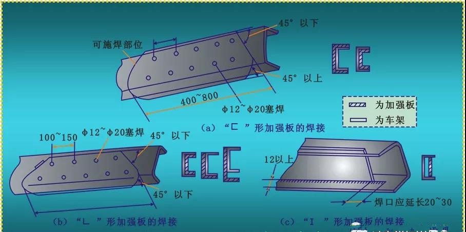步驟3:加強(qiáng)板與車架的焊接主要反映在腹板上。除了塞焊以外,加強(qiáng)板腹板的兩端也要分段施焊,一般禁止在車架翼面板上施焊。