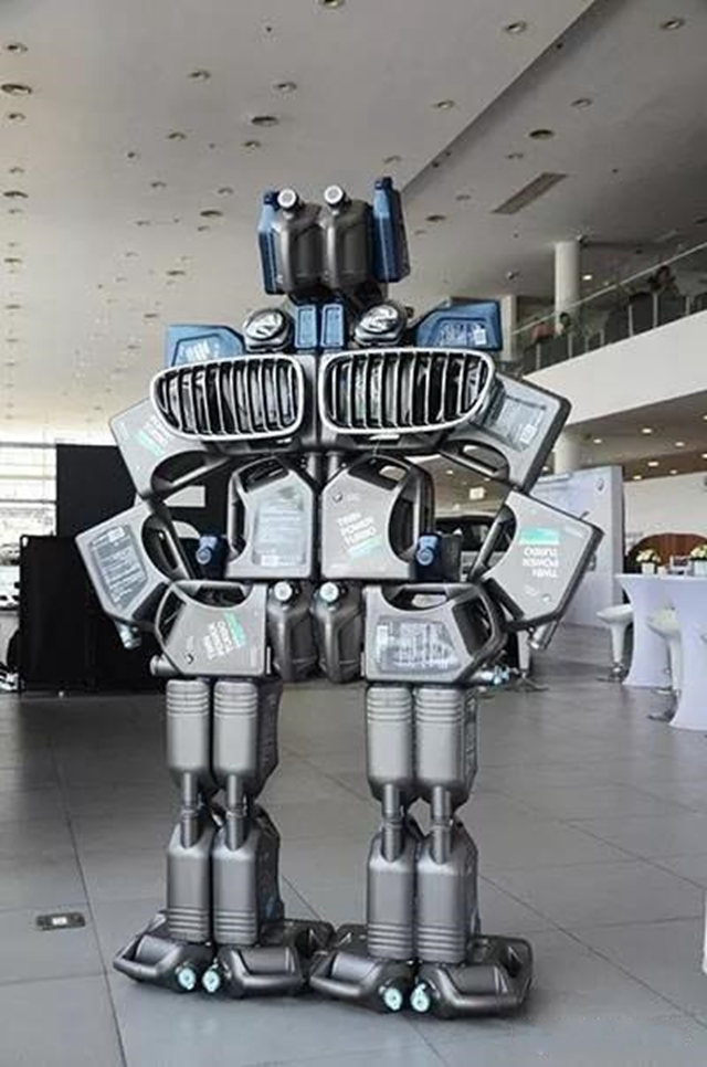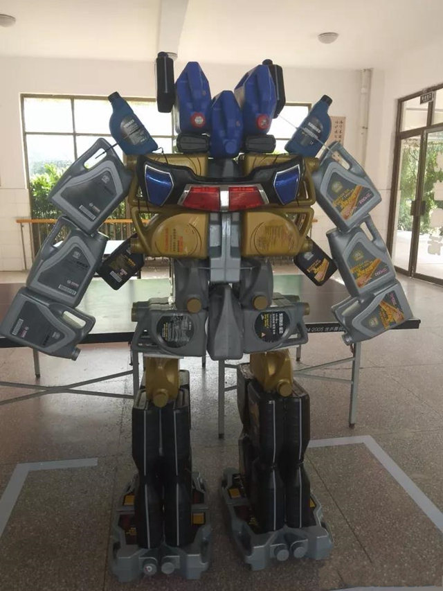 現(xiàn)實(shí)中,大家一走進(jìn)宿遷經(jīng)貿(mào)學(xué)院汽車(chē)工程系的大門(mén)就會(huì)見(jiàn)到一尊守護(hù)神——變形金剛,仔細(xì)看去,它是由機(jī)油桶制作而成,整整五十個(gè)。