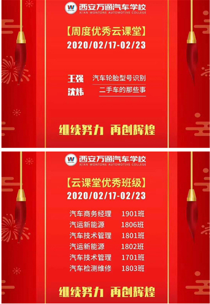 在2月17日至2月23日的云課堂周度評選中,王強老師所授的《汽車輪胎型號識別》和沈煒老師所授的《二手車的那些事》課堂被評為“優秀云課堂”,另有1701班、1801班、1802班、1803班、1806班、1901班共六個班級被評為“云課堂優秀班級”。