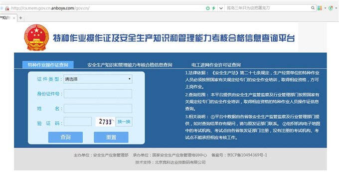 該系統為國家應急部官方查詢平臺按照國家應急部統一部署和要求各省、地市安監部門統一將特種作業人員信息上傳至該系統平臺。各省、地市安監部門所發特種作業操作證都可在該平臺查詢。