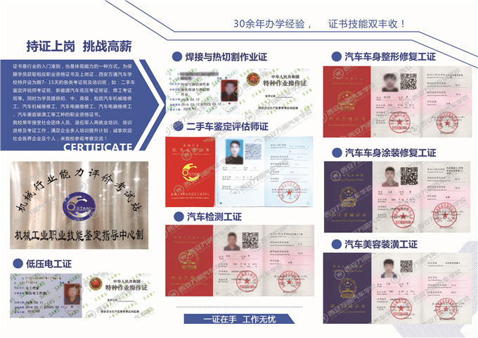 為保障學員獲取相應職業資格證書及上崗證,西安萬通汽車學校為學員提供初、中、高級,包括汽車機械維修工、汽車機械維修工、汽車電器維修工、汽車電器維修工、汽車美容裝潢工等工種的職業資格證書。