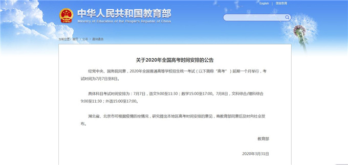 3月31日,國家教育部發(fā)布通知:經(jīng)黨中央、國務(wù)院同意,2020年全國普通高等學(xué)校招生統(tǒng)一考試(以下簡稱高考)延期一個月舉行,考試時間調(diào)整為7月7日至8日。另外據(jù)教育部統(tǒng)計(jì)今年參加高考的考生人數(shù)為1071萬,同比去年增加了40萬人。