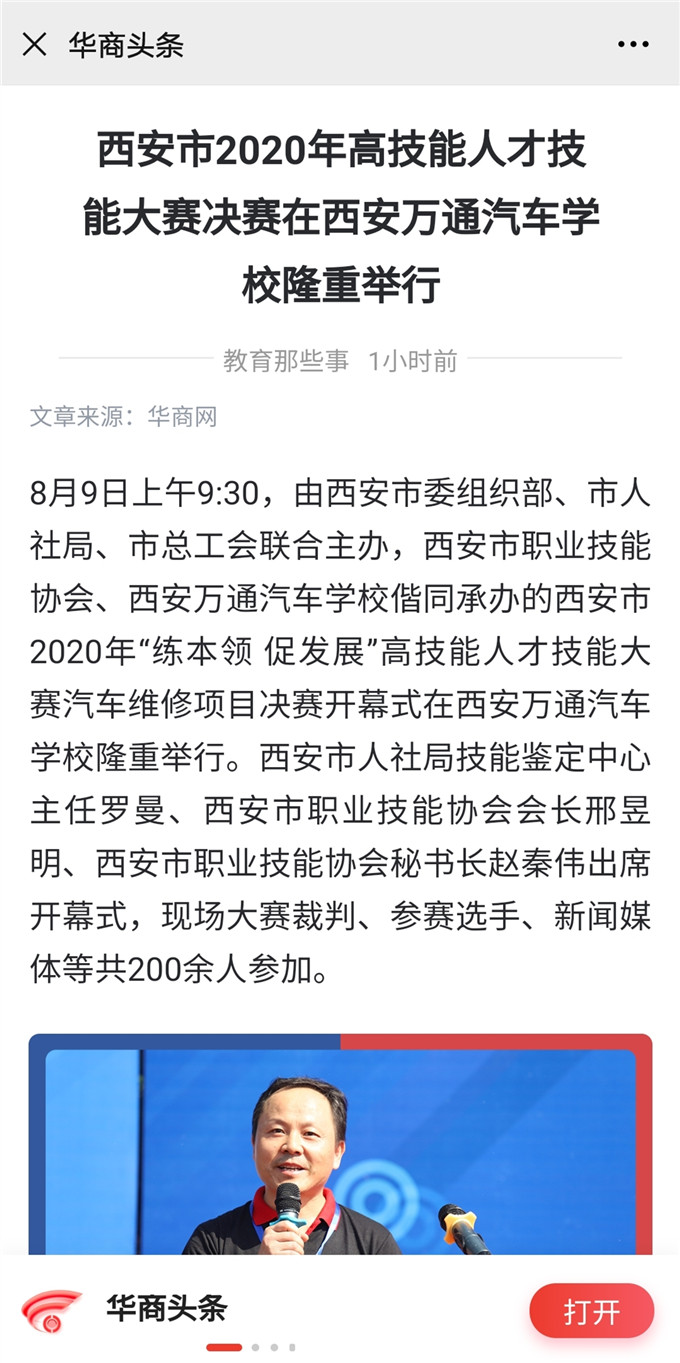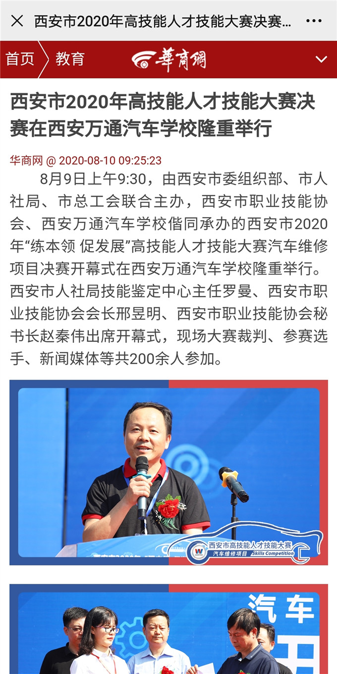 8月9日上午9:30,由西安市委組織部、市人社局、市總工會聯合主辦,西安市職業技能協會、西安萬通汽車學校偕同承辦的西安市2020年“練本領 促發展”高技能人才技能大賽汽車維修項目決賽開幕式在西安萬通汽車學校隆重舉行,引起了社會的廣泛關注,更是掀起了媒體報道的熱潮。騰訊網、華商網、華商頭條等多家權威媒體對此次活動進行了實時報道。