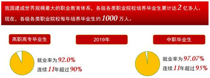 如今,在現代制造業、戰略性新興產業和現代服務業等領域,一線新增從業人員70%以上來自職業院校畢業生,職業院校畢業生成為支撐中小企業聚集發展、區域產業轉型升級和城鎮化發展的主力軍。2019年高職高專畢業生就業率為92.0%,連續11年超過90%;中職畢業生就業率為97.07%,連續11年超過95%。