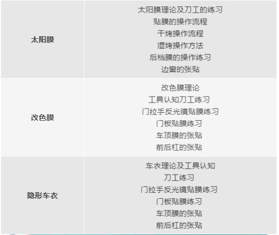 汽車“三膜”培訓(xùn)班主要針對當(dāng)下汽車裝潢模塊的貼膜工藝進(jìn)行培訓(xùn)學(xué)習(xí),分別從汽車玻璃太陽膜粘貼、車身改色膜粘貼、隱形車衣粘貼三個方面進(jìn)行系統(tǒng)化學(xué)習(xí)。