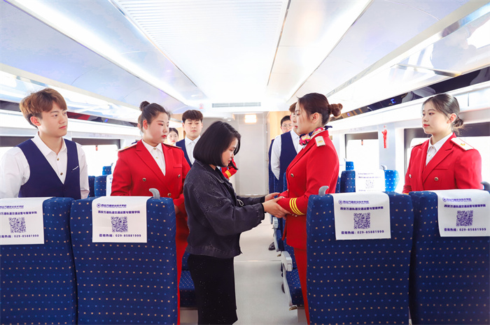 西安萬通不斷加強、完善軌道交通專業實訓室建設,課程中融合了現代管理學科與城市軌道交通行車、客運實務,課程設置體現理論與實踐相結合的教學理念。為了讓學生掌握前沿技術,西安萬通引進高鐵模擬艙,外觀按照復興號1:1仿真制作,長18米、寬3.25米、 高2.8米、空載13噸,含有復興號型車頭、列車控制室、一等座旅客、二等座旅客、餐車吧臺、洗漱間等功能區域。學生可以在日常學習中體驗真實工作場景。