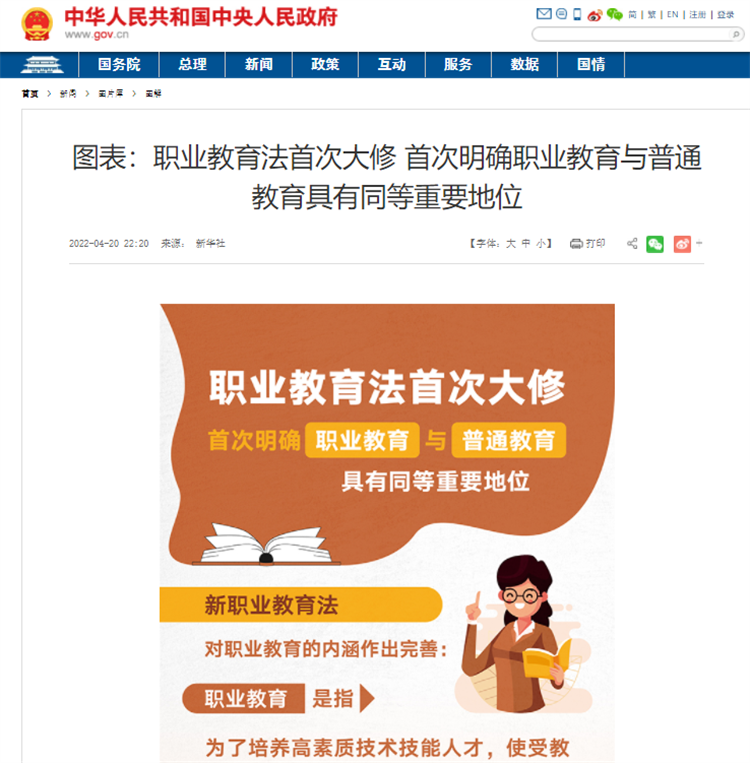近年來(lái),國(guó)家對(duì)職業(yè)教育高度重視,職教利好政策頻出。 2022年5月1日,新修訂的《職業(yè)教育法》正式施行,從立法層面上,首次明確職業(yè)教育與普通教育具有同等重要的地位。