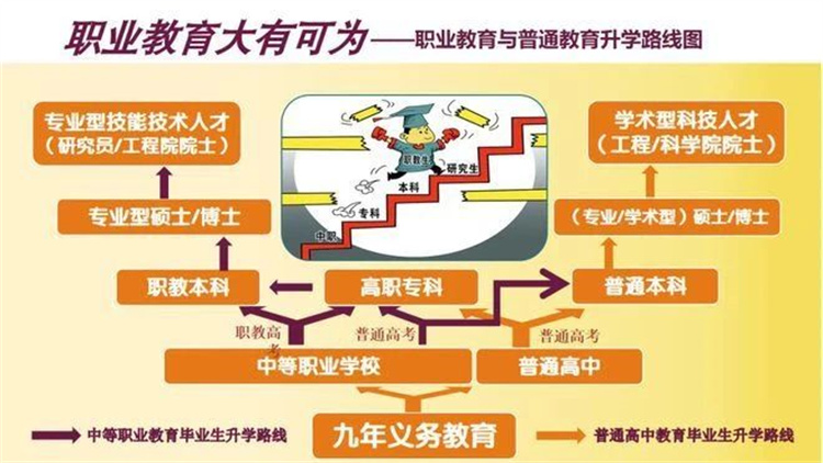 職教高考為中職學生拓寬升學之路 職教高考制度是與普通教育高考制度具有同等功能的考試招生制度。建立職教高考制度,旨在暢通技術技能人才成長渠道,全面構建中等職業(yè)教育、專科職業(yè)教育、本科職業(yè)教育、專業(yè)學位研究生教育相銜接的應用型人才培養(yǎng)體系,打破普通高考的獨木橋格局,形成職教、普教并行的高考雙車道。