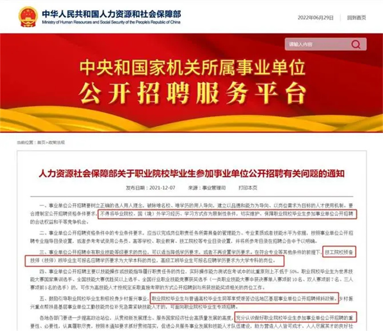 人社部印發(fā) 《關(guān)于職業(yè)院校畢業(yè)生參加事業(yè)單位公開(kāi)招聘有關(guān)問(wèn)題的通知》(以下簡(jiǎn)稱(chēng)《通知》),部署職業(yè)院校(含技工院校)畢業(yè)生參加事業(yè)單位公開(kāi)招聘工作。《通知》提出, 事業(yè)單位公開(kāi)招聘中有職業(yè)技能等級(jí)要求的崗位,可以適當(dāng)降低學(xué)歷要求,或者不再設(shè)置學(xué)歷要求。